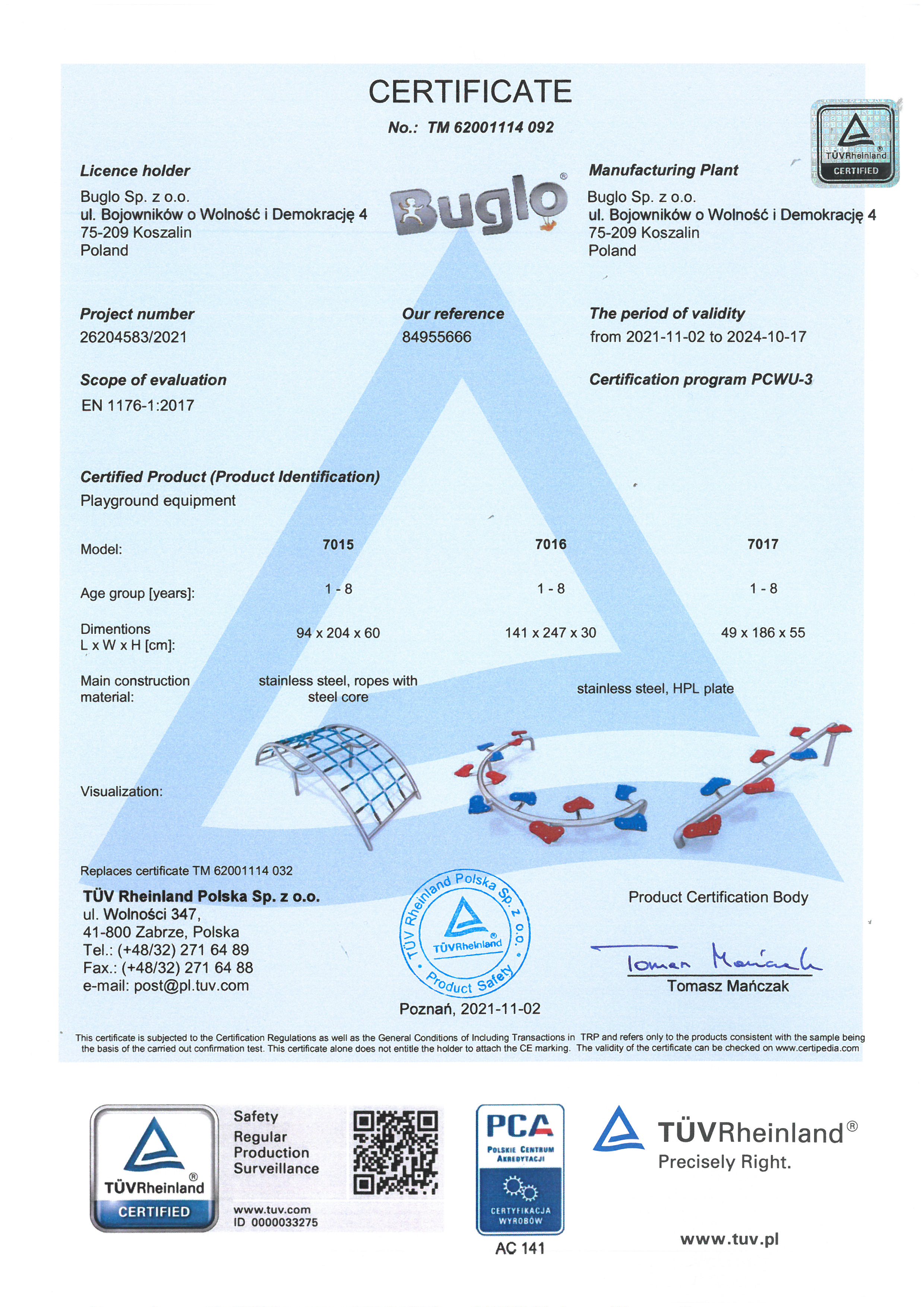 Toate echipamentele de recreere și de joacă trebuie să dețină certificate de conformitate cu seria de standarde EN 1176 – Echipamente și suprafețe pentru spații de joacă, (în cazul echipamentelor de fitness și street workout, standardul este EN 16630:2015).