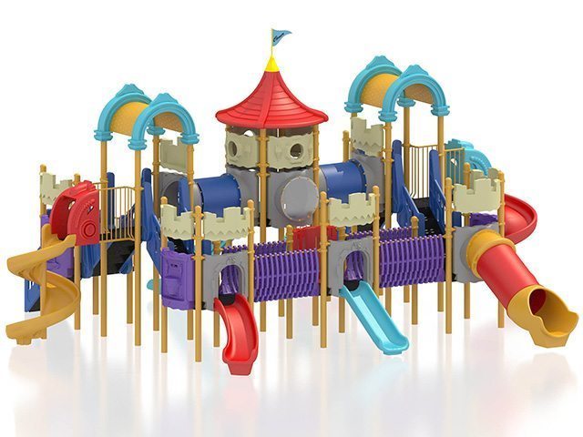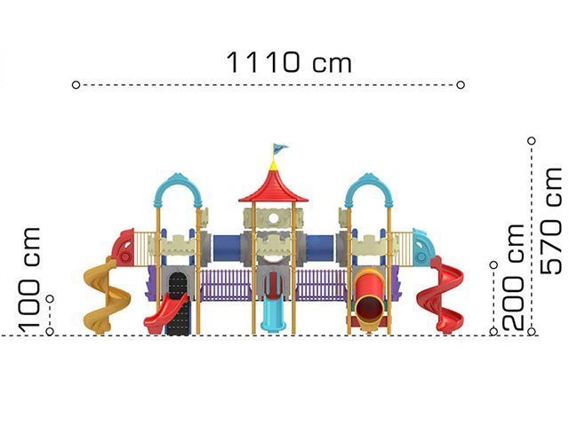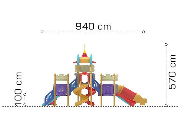 | Descriere: | Ansamblu de joacă în formă de castel, cu un turn la mijloc, mărginit de două puncte de observaţie cu acoperiş boltă, cu şase tobogane, două spiralate, două clasice, unul curbat şi unul cilindric, comunicând între ele prin tunele, poduleţe şi scări, cu jocuri tematice şi terase de observaţie. | ||||||||||||||||||||