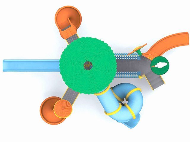 | Descriere: | Ansamblu de joacă cu trei turnuri, din care cel central de formă hexagonală, cu acoperiș, cu cinci tobogane, două spiralate, unul cilindric răsucit, unul clasic și unul curbat, cu scară de acces și decorațiuni cu păsări și flori. | |||||||||||||||||||