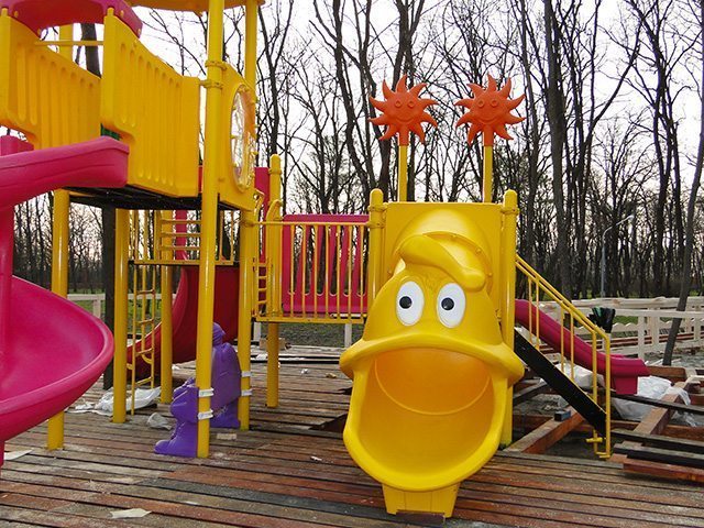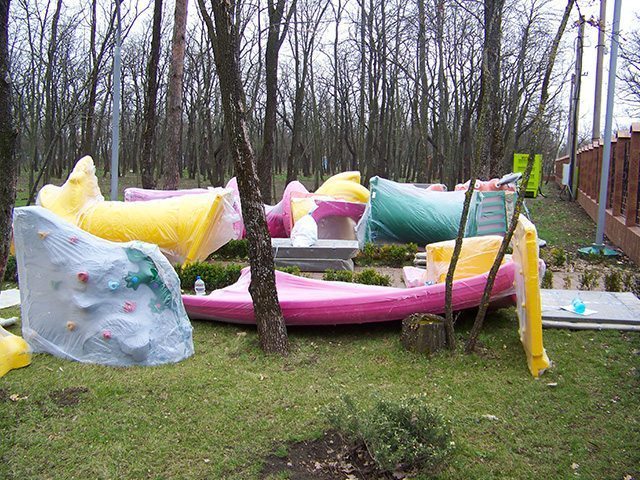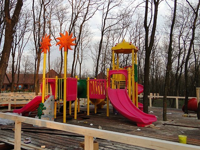 Structura de joacă este compusă dintr-un turn acoperit cu tobogan în spirală, un turn la înălţimea de 1,5m cu tobogan dublu şi căţărătoare, o pasarelă şi un turn mic de înălţime 1m, din care pleacă un tobogan cilindric sub formă de răţuşcă şi un tobogan simplu. Montajul acestui echipament s-a realizat într-o singura zi. Ancorarea s-a facut prin turnarea unor fundaţii de beton (B250). Armătura fundaţiei a fost prelungită până la platforma de lemn. Gropile au avut dimensiunile de 0.50 m x 0.50 m x 0.50 m.